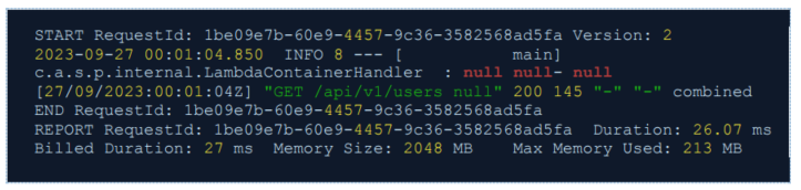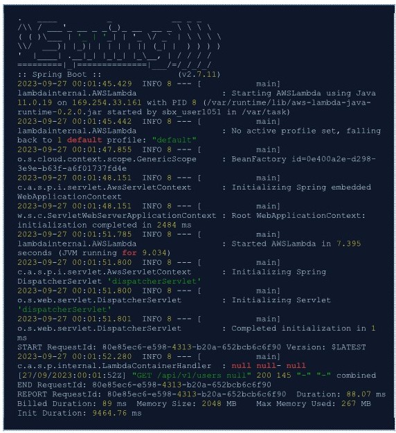 아래의 Log 는 Cold Start 가 발생한 경우이며, 새로운 인스턴스가 실행되어 Spring Boot이 Bootstrap 하는 Log를 확인할 수 있습니다.