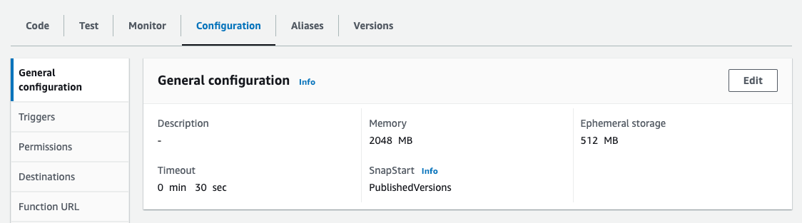Lambda Console 화면에서 SnapStart의 값이 PublishedVersions로 표시가 된 것을 확인할 수 있습니다.