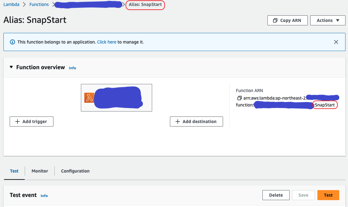 아래의 그림과 같이 상단에 “Alias: SnapStart” 표시가 됩니다. 저는 Alias로 SnapStart라고 지정했습니다.