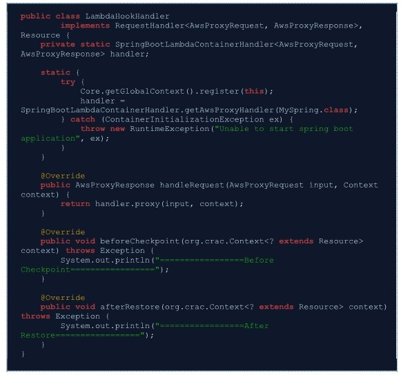 Lambda에서는 SnapStart를 사용하는 경우에 beforeCheckpoint, afterRestore 2가지 런타임 Hook을 제공합니다.
