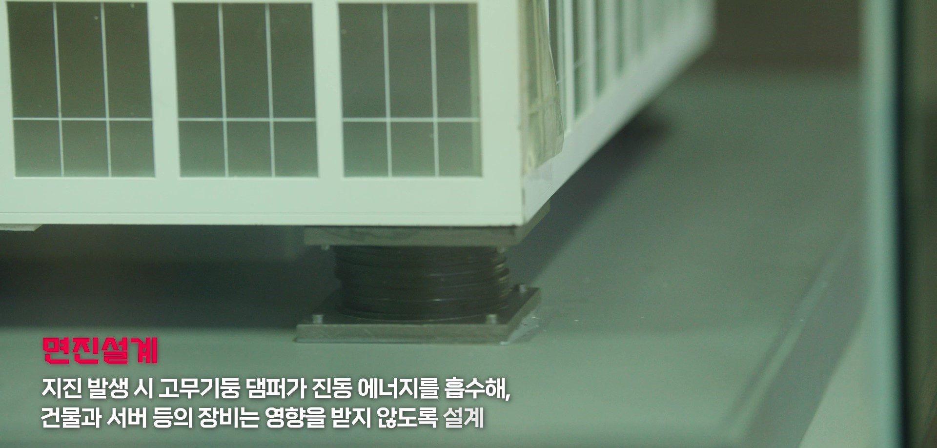 LG CNS 부산 글로벌 클라우드 데이터센터는 국내 최초 규모 8.0 강진도 견딜 수 있는 면진 구조로 설계됐습니다. 우리가 흔히 알고 있는 내진 설계는 일정 수준의 지진을 견딜 수 있지만, 강진이 발생하면 건물 내 장비는 넘어지기 마련입니다. 하지만, 면진 설계는 지진 발생 시 고무 기둥 댐퍼가 진동 에너지를 흡수해 건물과 서버 등 장비는 영향을 받지 않도록 설계됩니다.