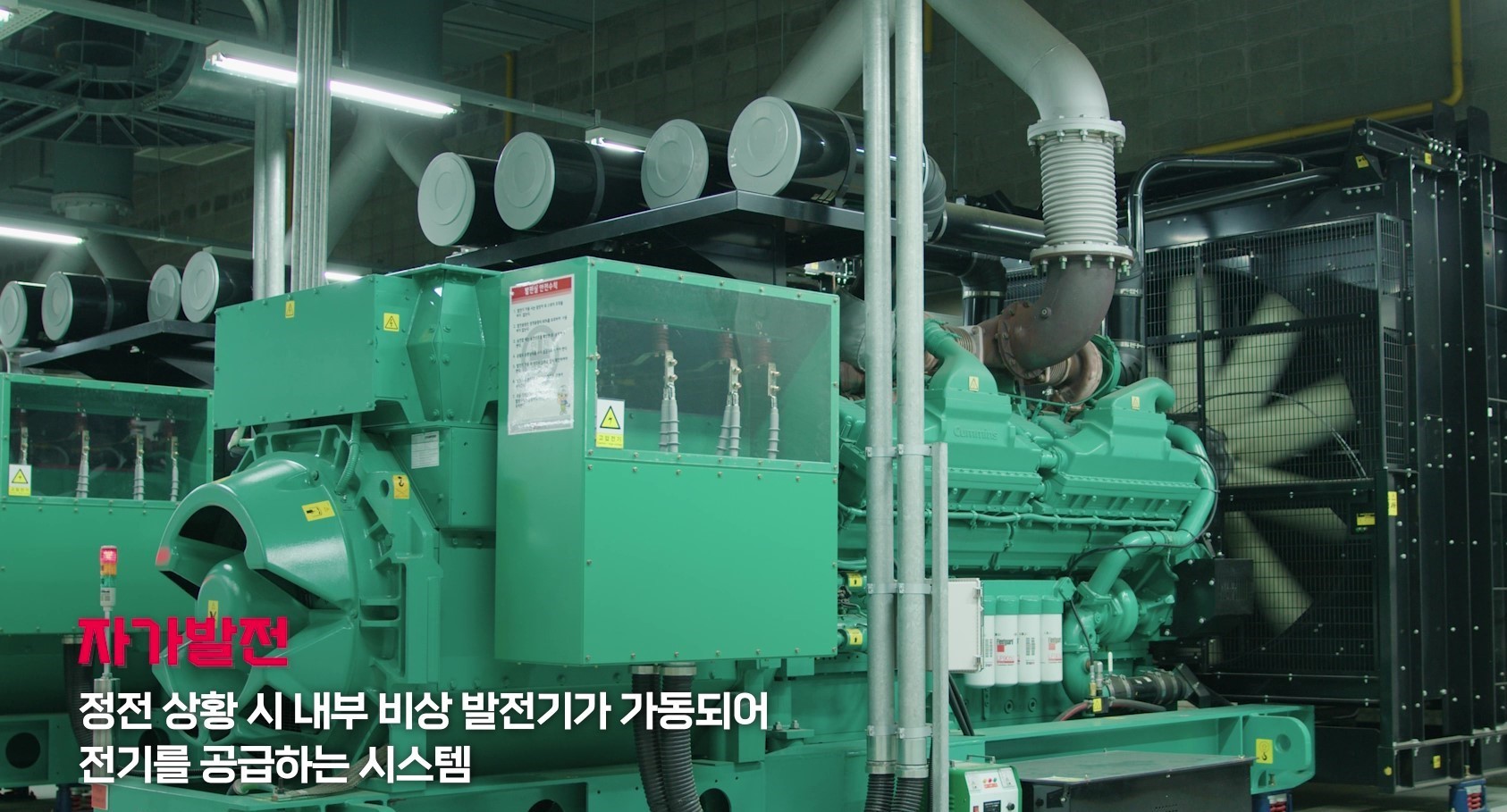 고객에게 24시간 365일 무중단으로 서비스를 제공하기 위해서 가장 중요한 것은 전기 공급입니다. 아파트에도 원활한 전기 공급이 중요한 것처럼 데이터센터 서버/냉방기/배터리 등의 설비를 안정적으로 운영하려면 충분한 전력량이 필요합니다. LG CNS 부산 클라우드 데이터센터는 40MW로, 서울 목동 전체 가구가 한 달 동안 이용하는 전력을 운영하고 있습니다. 그뿐만 아니라 이중화된 변전소(발전소에서 생산된 전기를 선로를 통해 송전받아 변환하여 수요처로 배전하는 시설)에서 안정적으로 전원 공급을 하고 있어 한 군데 이상이 생겨도 문제가 없습니다. 만약, 정전이 발생해도 자가발전 시스템으로 동일 용량의 전원 공급이 가능한데요. 30분 이상 배터리로 백업하는 사이, 비상 발전기가 1분 이내에 가동돼 전기를 공급합니다.