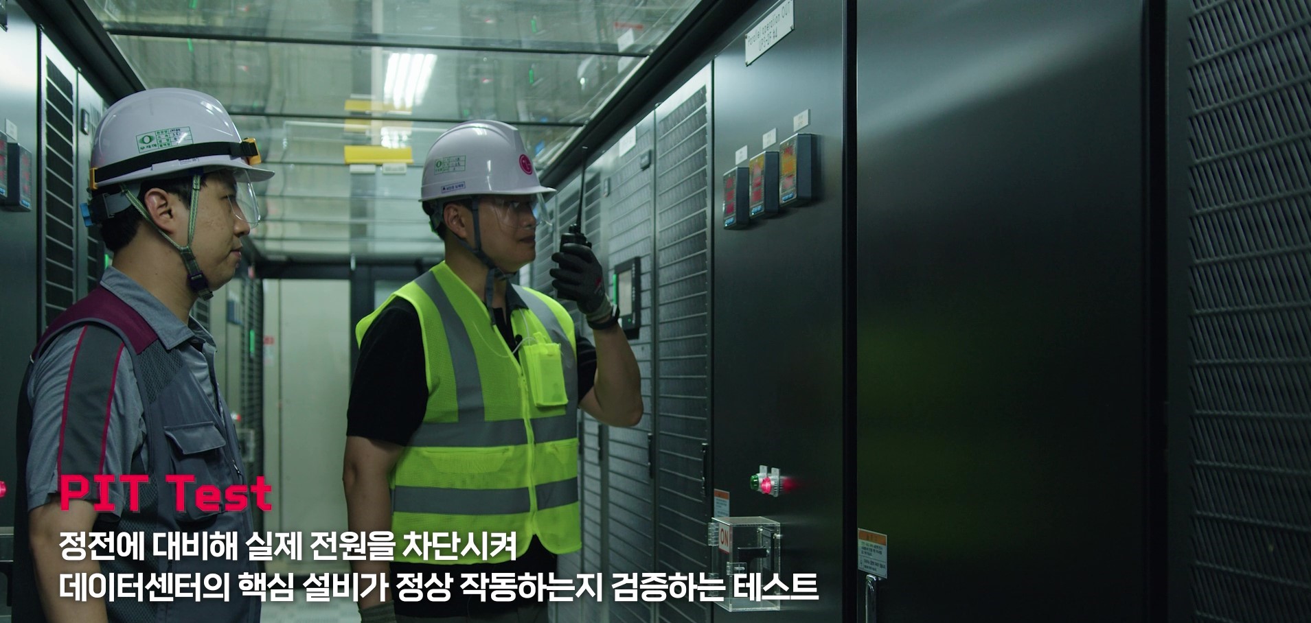 LG CNS 데이터센터는 글로벌 기준에 맞춰 국내 최초로 실제 전기를 중단시켜 훈련하는 PIT(Power Interruption Test, 실제 전원을 차단해 데이터센터의 설비가 정상 작동하는지 검증하는 테스트)를 매년 실시하고 있습니다. 전기실 설비는 전력 계통에 따라 서로 다른 색으로 표시했는데요. (적색은 IT, 청색은 냉방, 사무실 백색, 공통영역은 황색으로 표시) 고속도로 색깔 유도선을 아이디어로 착안해 돌발 상황에서도 완벽하게 대응하기 위해 노력하고 있습니다. 실제로 모든 재난 시에도 위급상황, 진척 상황, 자산의 이상 여부 등을 실시간으로 고객에게 전달하고 있습니다.
