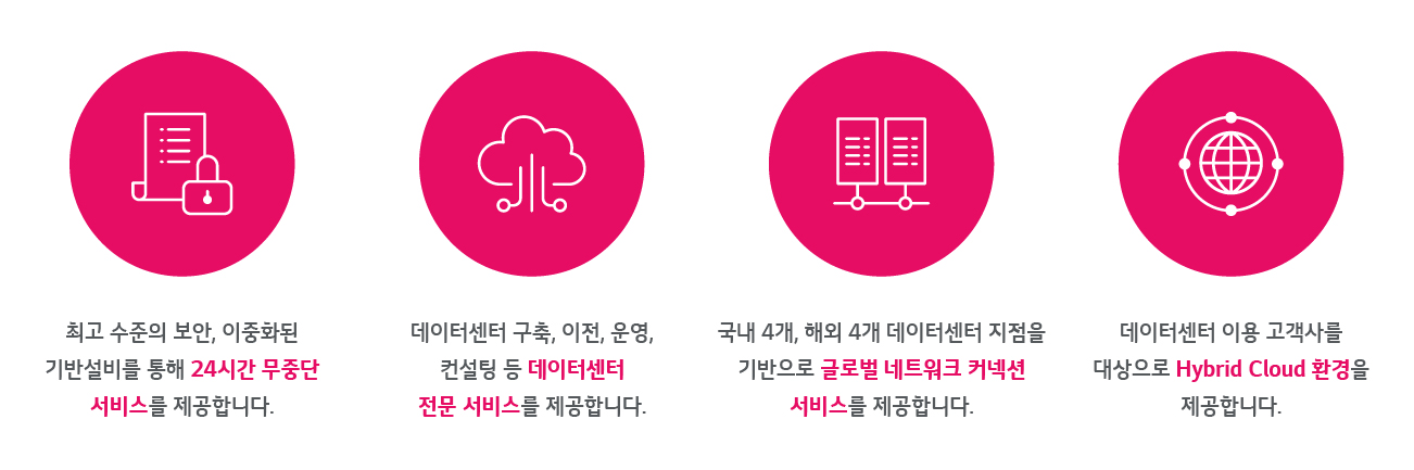 LG CNS의 데이터센터는 1992년 국내 최초의 데이터센터인 인천센터를 오픈한 이후, 상암 IT센터, 부산 글로벌 클라우드 데이터센터, 가산센터와 미국/유럽/중국 등 4개 글로벌 거점에서 운영되고 있는데요. 이중화된 설비와 면진 설계, 극대화된 전력 효율뿐만 아니라, 표준화•자동화된 운영 환경과 프로세스를 통한 그린 데이터센터로 인정받고 있습니다.