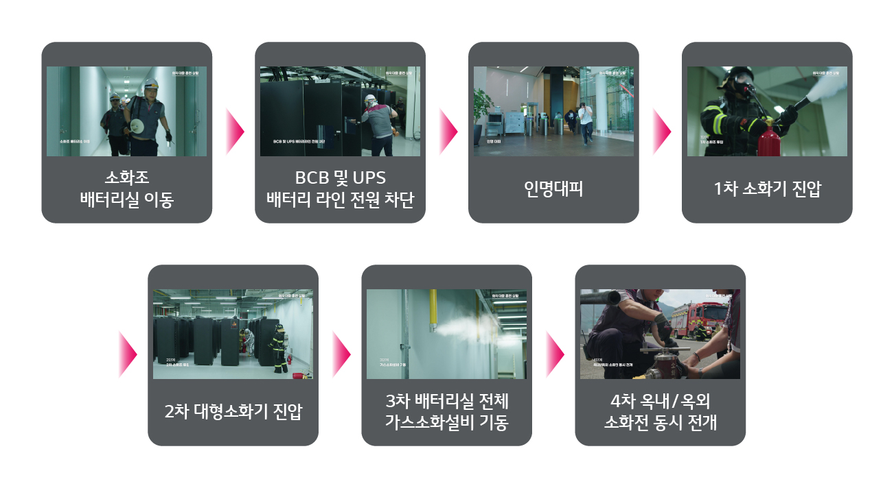 LG CNS 데이터센터는 화재 발생 즉시 데이터센터의 심장부인 통합관제센터에서 상황 파악을 합니다. LG CNS의 기술력으로 구축한 AI CCTV가 연기나 불꽃 같은 징후를 탐지해 화재 발생 위치를 알려주는데요. 고도로 숙련된 비상 대응팀은 신속하게 각자 위치로 이동해 [그림 1]과같이 단계별 매뉴얼에 따라 화재에 대응합니다.