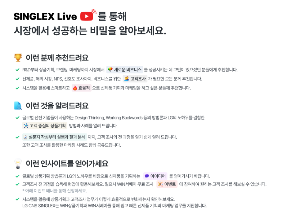 재미있게 읽으셨나요? LG CNS의 SINGLEX WIN상품기획을 더 알고 싶으시다면, 영상을 통해 LG CNS의 상품기획 스페셜리스트들이 전해드리는 상품기획과 마케팅 인사이트를 확인해 보세요!