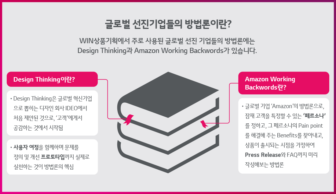 지난 Live를 놓쳐 아쉬우실 분들을 위해 방송 하이라이트 영상을 준비해 보았는데요. 이번 글에서는 Live 내용 중에서도 ‘Amazon 등 글로벌 선진기업들의 방법론’과 ‘LG그룹사들의 우수 사례’를 모아 만들어진 ‘WIN상품기획의 대표적인 4가지 방법론’ 부분을 소개해 드리겠습니다.
