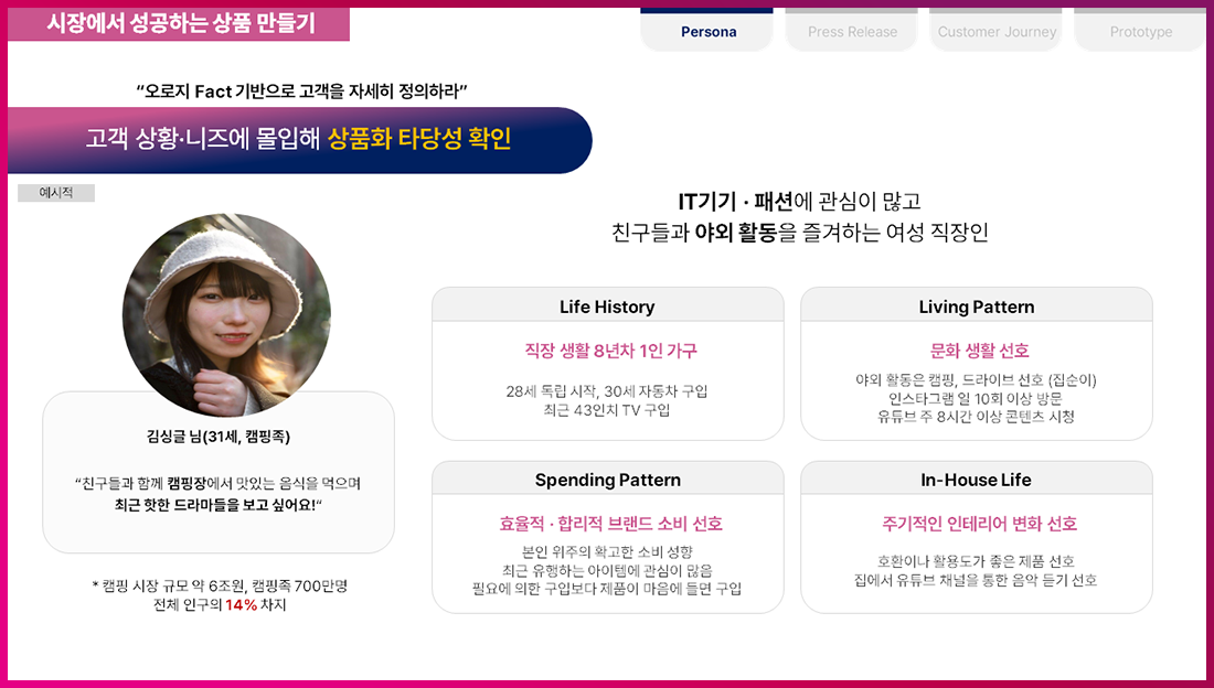 A. 먼저 이름, 나이, 직업 등 고객을 매우 상세하게 특정해 가정합니다. 고객의 Life history, Living Pattern, Spending Pattern, In-house Life 등을 마치 우리가 잘 알던 사람인 것처럼 생생하게 정의합니다. 이는 고객이 무슨 pain point를 가지고 있고, 어떤 혜택을 제공해 문제를 해결할 수 있는지 찾는 방식의 접근입니다.
