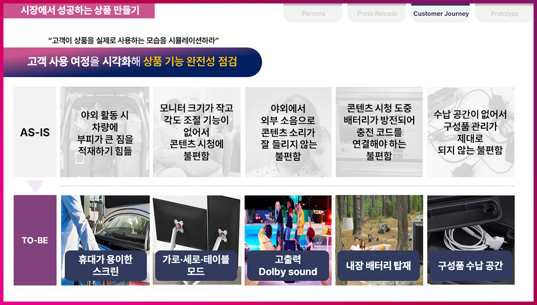 A. 두 개념은 비슷하지만, ‘고객 경험’이라는 관점에서 차이가 있습니다. CDJ가 각 단계 별로 ‘구매 결정 요인’을 분석하는 것이라면, CEJ는 ‘모든 접점’에서 고객에게 좋은 ‘실사용 경험’을 제공하기 위한 해결 방안을 찾아내는 것입니다. 이미지를 보면 고객의 현재 pain point를 여러 각도로 관찰한 후, 더 나은 고객 경험을 여러 측면으로 도출해 상품 기능의 완전성을 점검한 것을 알 수 있습니다.
