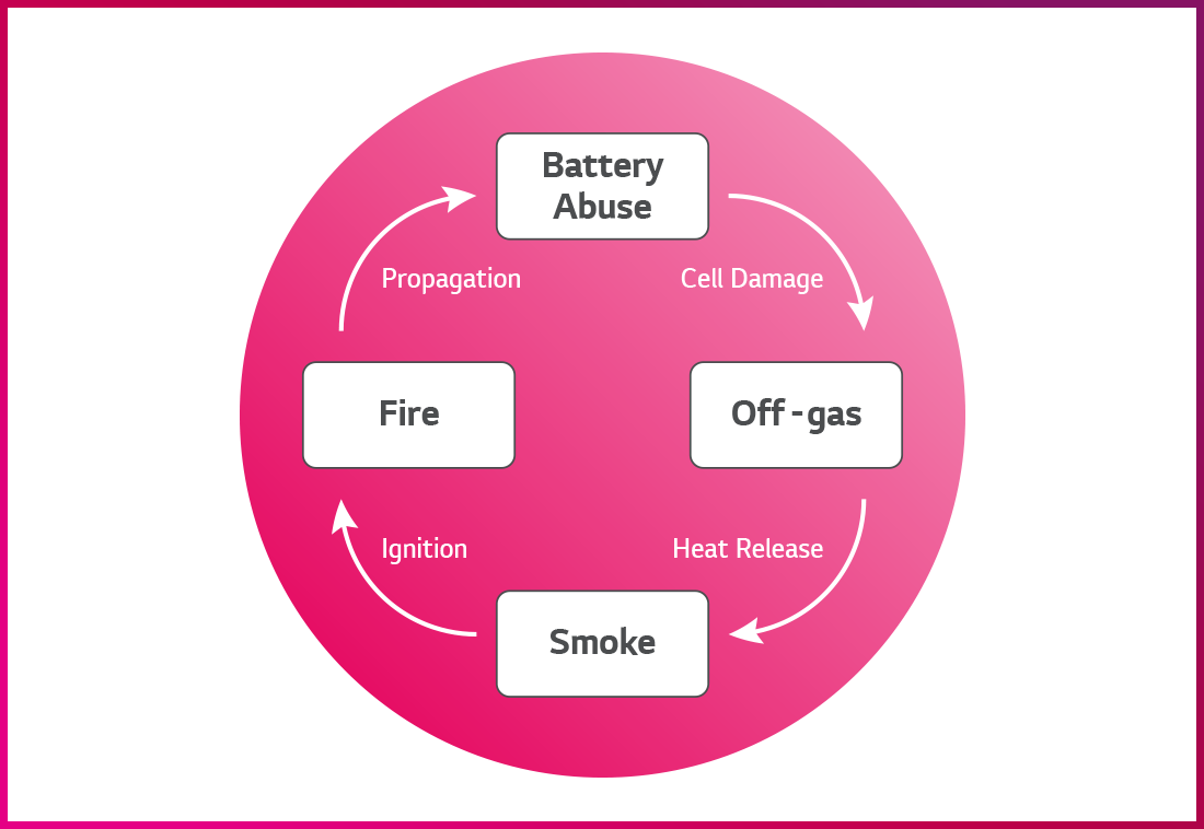 배터리 Cell 화재는 4단계로 진행됩니다. 먼저 열, 전기, 물리적 충격 등으로 배터리가 지속적인 스트레스를 받으면 (1단계: Battery Abuse) 전해질이 끓어오르면서 내부 압력이 증가하고 배출(Venting)이 발생해 가스와 중기가 나옵니다. (2단계: Off-gas) 그 후 연기가 나오면서 열 폭주가 임박해지면 (3단계: Smoke) 실제 화재가 발생하고, 인접 셀(Cell)에도 열적 충격이 가해집니다. (4단계: Fire)