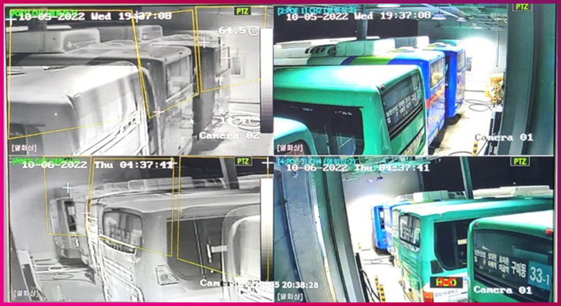 열화상 센서는 특정 지점에서 설정 기준 이상의 온도가 탐지되면, 알림을 통해 모니터링 영상을 제공합니다. 열화상 센서 카메라는 열폭주 전 해당 장비의 발열 감지 포인트를 정확하게 탐지할 수 있는데요. 또한 열을 탐지하기 때문에 연기나 먼지, 소화 분말 등 시각적 탐지 방해 요소의 영향을 받지 않아 전기차 충전소와 같은 외부 환경에서도 활용할 수 있습니다.