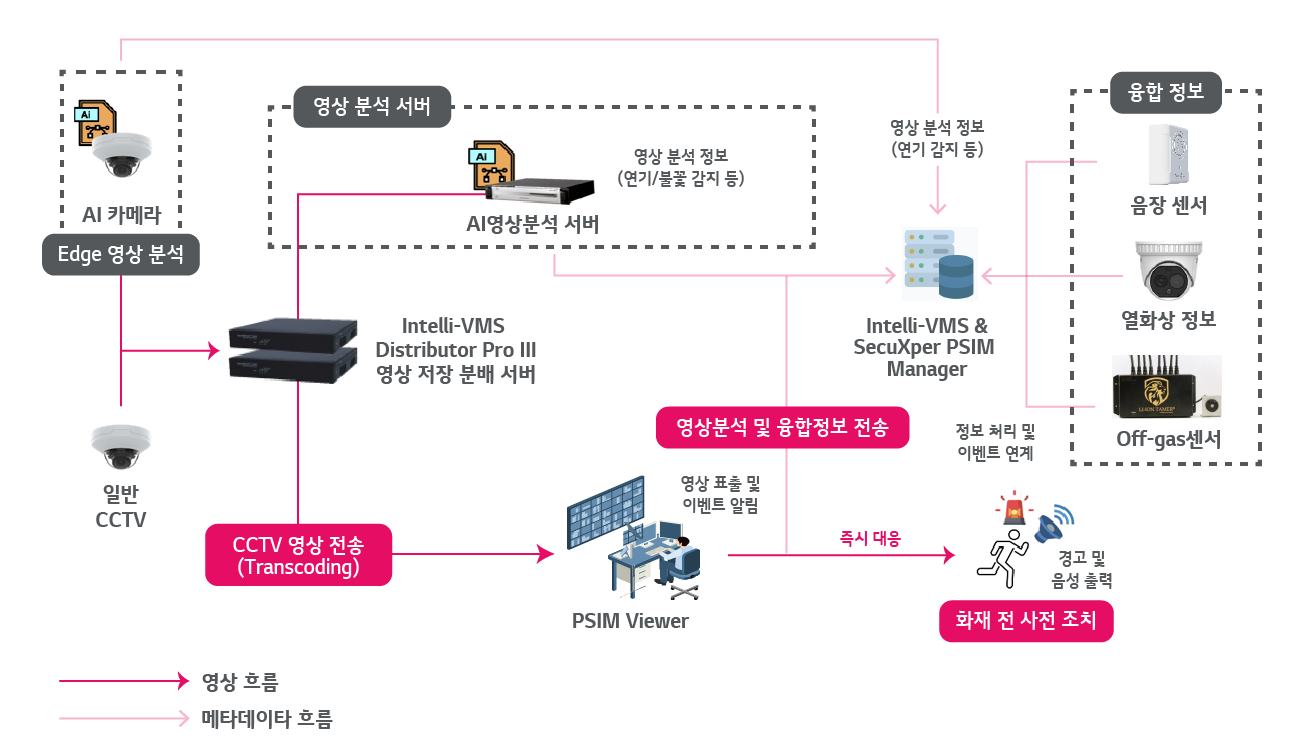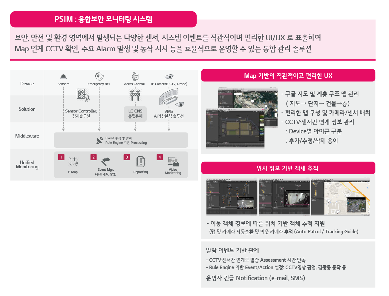 앞서 살펴본 다양한 데이터센터 화재 대응 솔루션은 LG CNS의 통합 보안 플랫폼 ‘SecuXper PSIM(SecuXper Physical Security Information Management)’과 함께 구축할 수 있습니다.