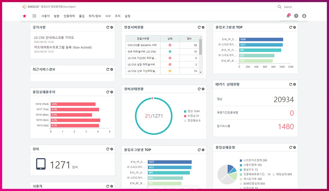 기존 출입통제 서비스(구 IDP)에서 전환된 SINGLEX 출입보안 통합플랫폼(SecuXper)은 엔터프라이즈 환경에 적합한 솔루션입니다. 기존 출입통제 시스템의 불편 사항들을 해소하고, 성능 이슈를 개선해 안정적인 시스템 운영이 가능해졌습니다. 서버 자원 및 디바이스, 출입 이벤트 등 실시간으로 발생하는 이벤트에 대한 모니터링 및 통계 기능과 다양한 장비에 대한 원격 제어 및 관리 기능이 추가되었습니다.