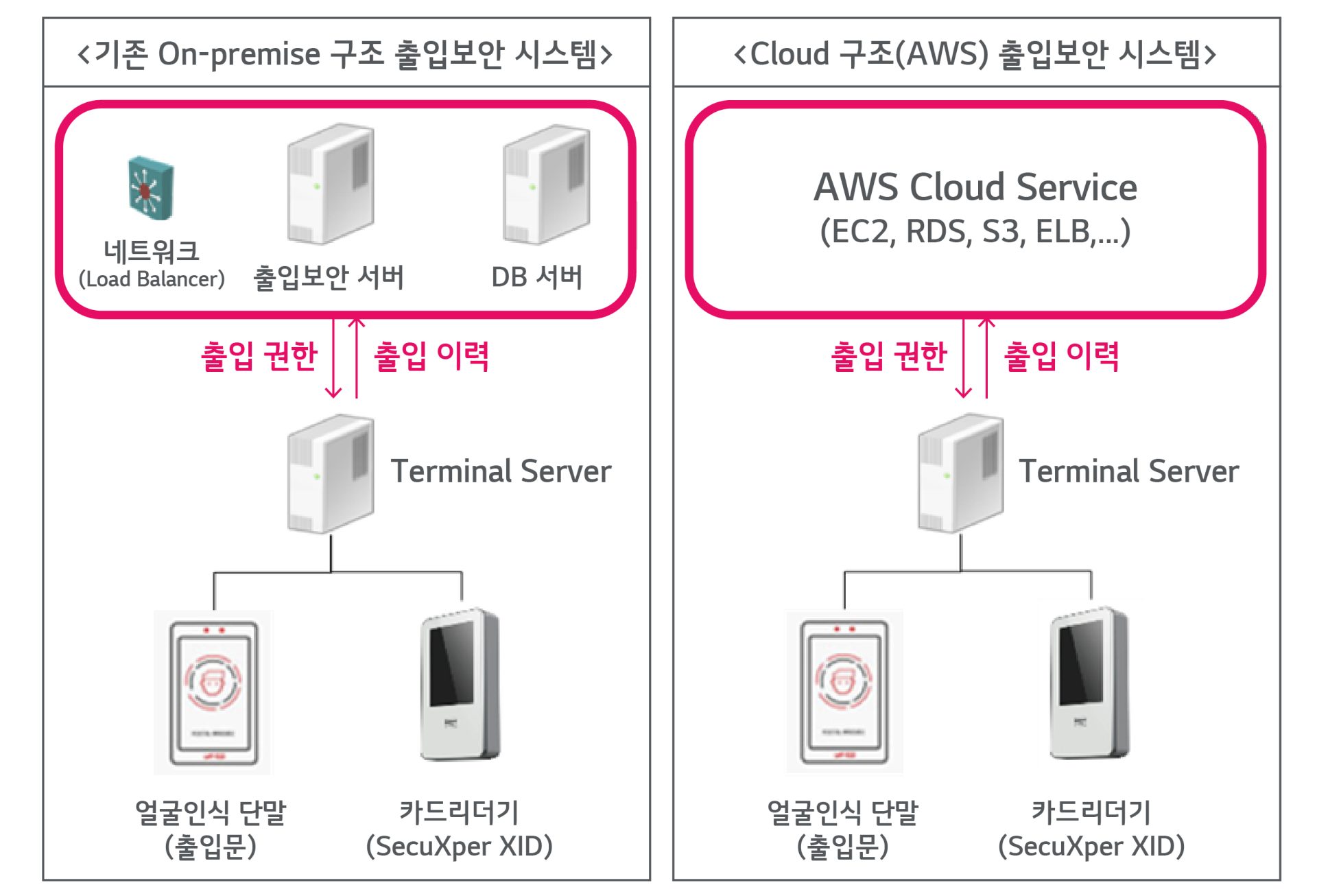 기존의 출입통제시스템은 자체적으로 보유한 물리적인 공간에 서버, 스토리지, 네트워크 등의 하드웨어 장비를 가지고 직접 IT 인프라를 보유하고 운영하는 온프레미스(On-premise) 방식으로 구축되었습니다. 온프레미스 방식은 데이터와 시스템을 직접 관리하면서 기업 자체적으로 보안정책을 수립하고 시스템을 모니터링하여 보안 수준이 높다는 장점이 있지만, 확장성 부족, 서버 유지관리를 위한 인력이 필요하다는 점, 초기 구축 및 유지관리에 필요한 자본 비용이 높다는 점, 오작동이나 해킹, 바이러스로 인한 데이터 손실 위험이 크다는 단점이 존재했습니다.