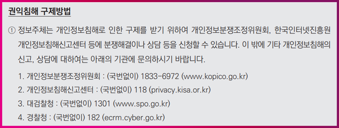 마지막으로 정보주체의 권익 침해 시 구제방법 안내를 위해 전문기관, 수사기관 정보를 아래와 같이 기재해야 하며, 최신 정보가 기재됐는지 확인해야 합니다.