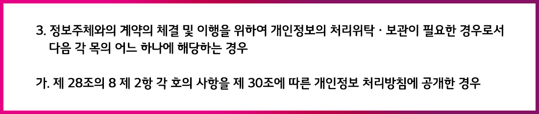 중요도가 높은 시스템의 경우, 재해ᆞ재난 대비를 위해 리전에 DR(Disaster Recovery, 지진, 화재, 테러 등의 재해 속에서도 서비스가 유지되도록 도와주는 시스템)을 구축하며, 이를 통해 서비스의 가용성을 보장합니다. 이 경우 해외 리전을 사용하게 되며, 이는 국외 이전에 해당됩니다. 개인정보 보호법 28조의 8에 따르면 개인정보를 국외 이전하는 경우 정보 주체의 동의를 받아야 하지만, 예외적으로 동의를 받지 않아도 되는 상황을 명시하고 있습니다.