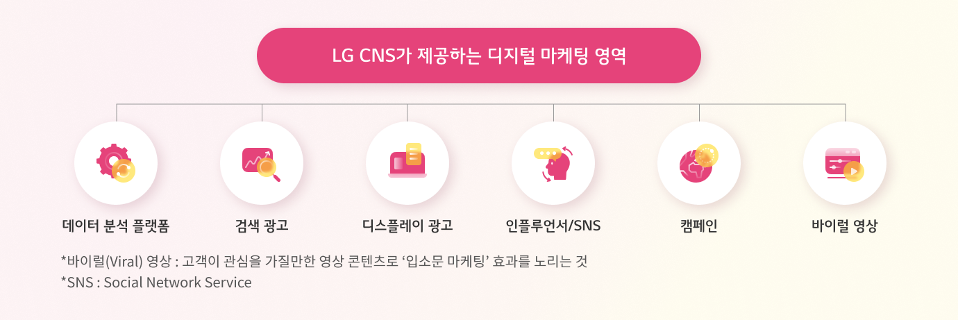 LG CNS는 AI, 데이터 분석, 타깃 최적화 등 최신 DX기술을 결합한 디지털 마케팅을 진행합니다. LG CNS 전문가들이 마케팅 계획, 콘텐츠 제작, 광고효과 분석 등을 수행하고 있으며, 각국의 파트너사와 함께 협업해 글로벌 현지에 최적화된 디지털 마케팅 활동을 펼치고 있습니다.