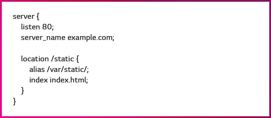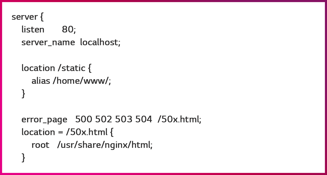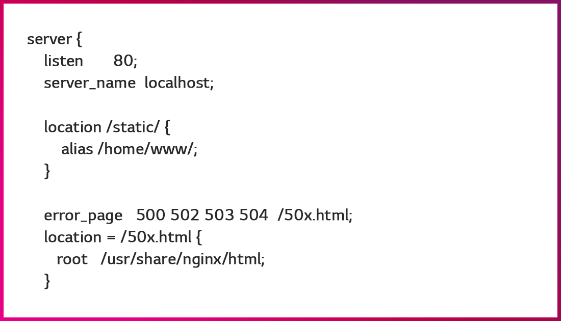 URL 상위 디렉터리로 이동하는 것은 기본적으로 차단됩니다. 하지만 간혹 개발자의 Nginx 취약한 설정을 통해 웹 서비스 상위 디렉터리에 접근이 가능한 경우도 있습니다. 먼저 Nginx Location 기능은 특정 URL 경로 또는 패턴에 대해 정의하는 구문입니다. 도메인 주소가 (http://lgcns-sample.com)이고 /static으로 접근한다면 alias 지시문을 통해 서버 내 /static 디렉터리로 접근하는 경로는 /var/www/static으로 매핑돼 처리됩니다.