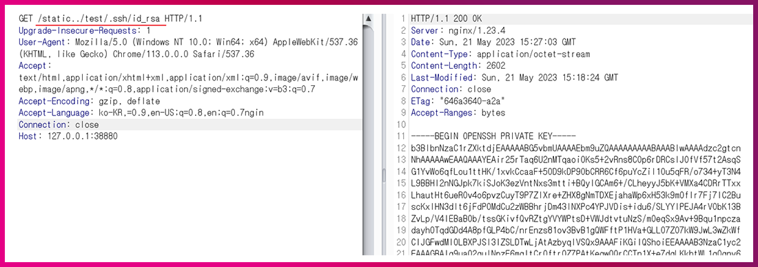 location/static 경로에서 /(슬래시)로 닫히지 않기 때문에 ‘/static’ 글자만 매핑 시켜준다면 /home/ 경로로 접근이 가능해집니다. /home/test라는 가정의 홈 디렉터리로 이동할 수 있다면 ssh 키 혹은 bash_history를 다운받을 수도 있습니다.
