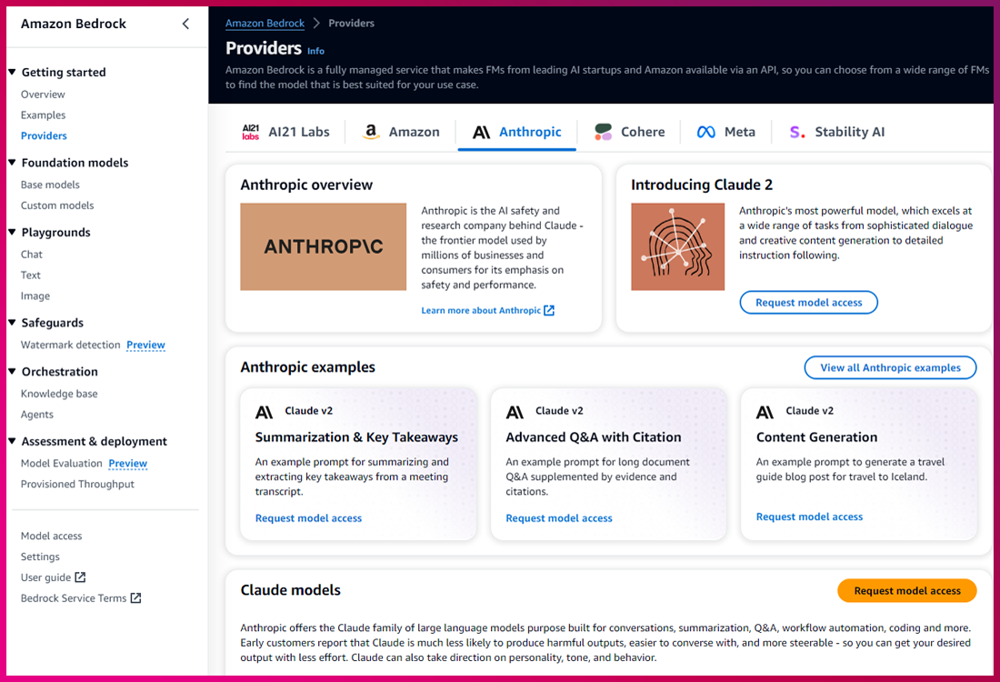 • AWS Console ➔ Amazon Bedrock ➔ Providers ➔ Anthropic ➔ Request Model Access