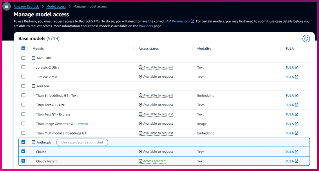 • Manage Model Access ➔ Claude ➔ Save Changes