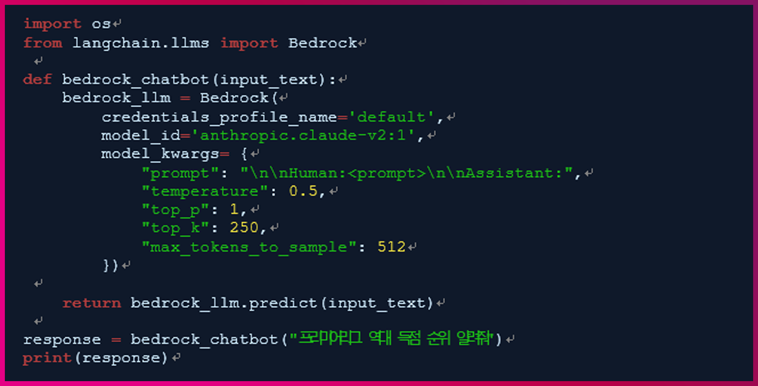그리고 Bedrock 객체를 생성할 때, credentials_profile_name, model_id, model_kwargs 등의 인자를 설정하는데요. 이때 Credentials_profile_name은 AWS 자격증명 프로파일의 이름을 지정하는 것이고, model_id는 사용할 모델의 ID를 지정하는 것입니다.