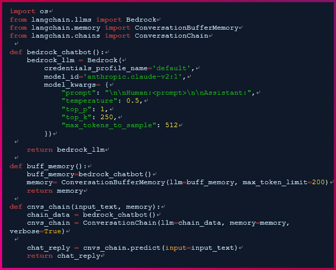 bedrock chatbot 함수는 input_text라는 매개변수를 받아들이고, 이를 통해 Bedrock 모델을 활용해 챗봇의 응답을 생성합니다.
