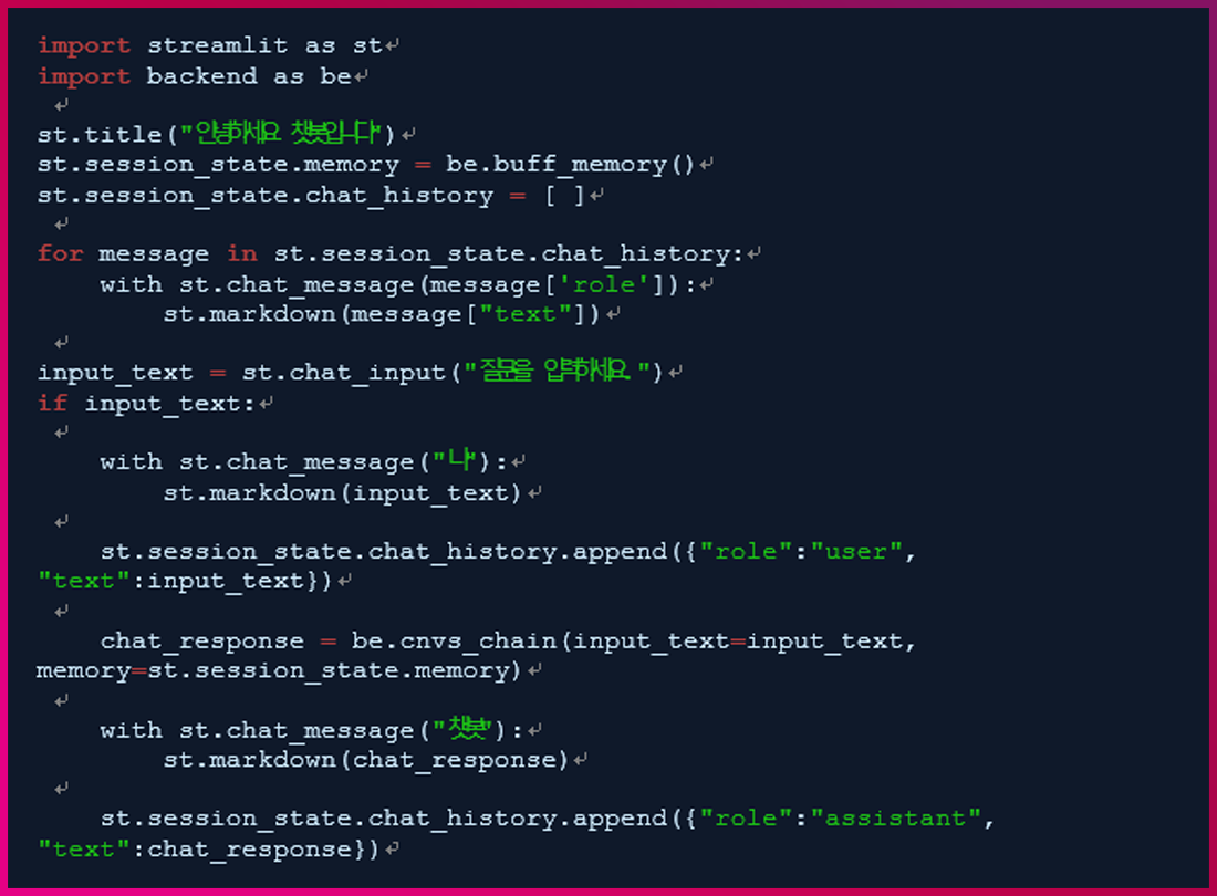 Be.cnvs_chain을 호출해 챗봇의 응답을 생성하고 이를 출력합니다. 위와 마찬가지로 st.session_state.chat_history에 채팅 기록이 추가됩니다.