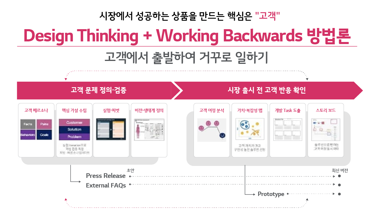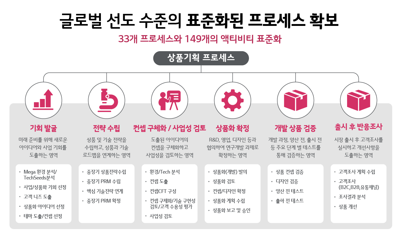 이러한 니즈를 바탕으로 LG는 2019년부터 이러한 상품기획 시장의 변화를 포착했습니다. LG가 지향하는 ‘고객 중심 상품’ 기획을 위해 프로세스 혁신이 필요하다는 목소리가 내부에서부터 시작됐고, 상품 기획자들의 고민을 덜기 위해, 글로벌 선진기업의 상품기획 방법론과 LG의 상품기획 프로세스를 통합해보자는 아이디어를 기획했습니다. LG 전자, LG 디스플레이, LG 이노텍 등 9개 계열사와 약 4년여간 협력하여, 각 계열사의 상품기획 프로세스 현황과 Pain Point를 분석하고, 이를 바탕으로 최고의 상품기획 프로세스를 정의했습니다.