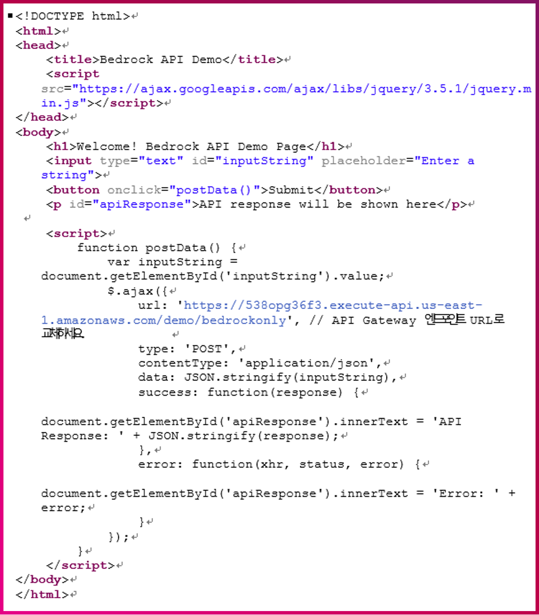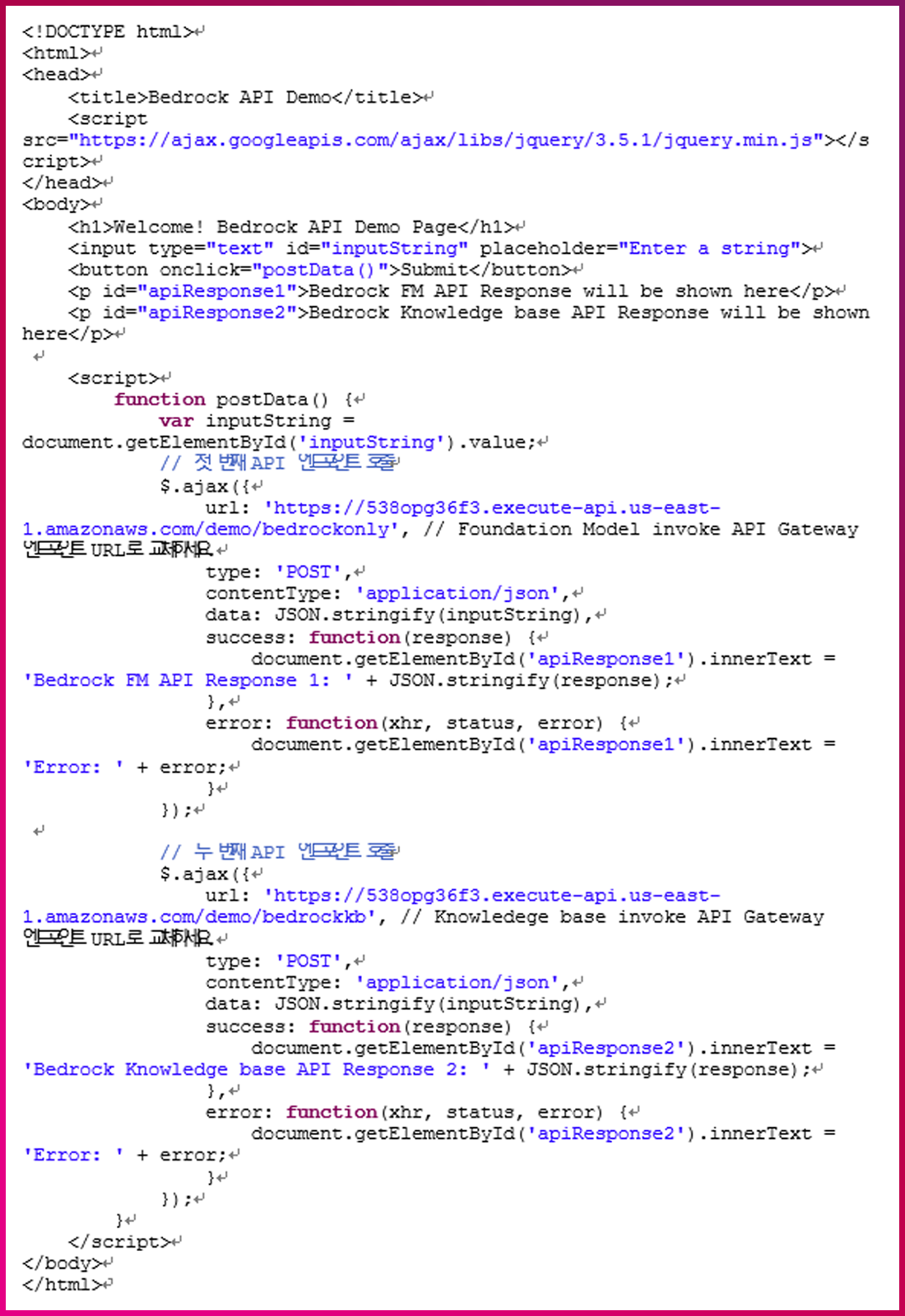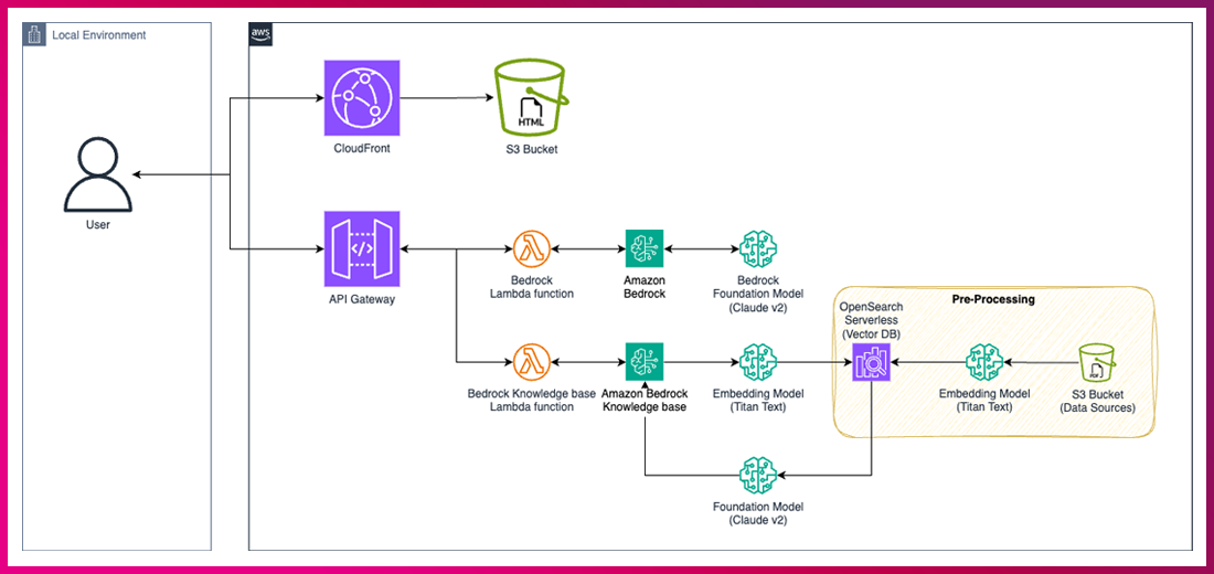 이번 데모에서는 Bedrock 환경을 사용자 Local 환경에서 직접 테스트해보기 위해 API Gateway와 정적 웹 호스팅을 구현해 보겠습니다.