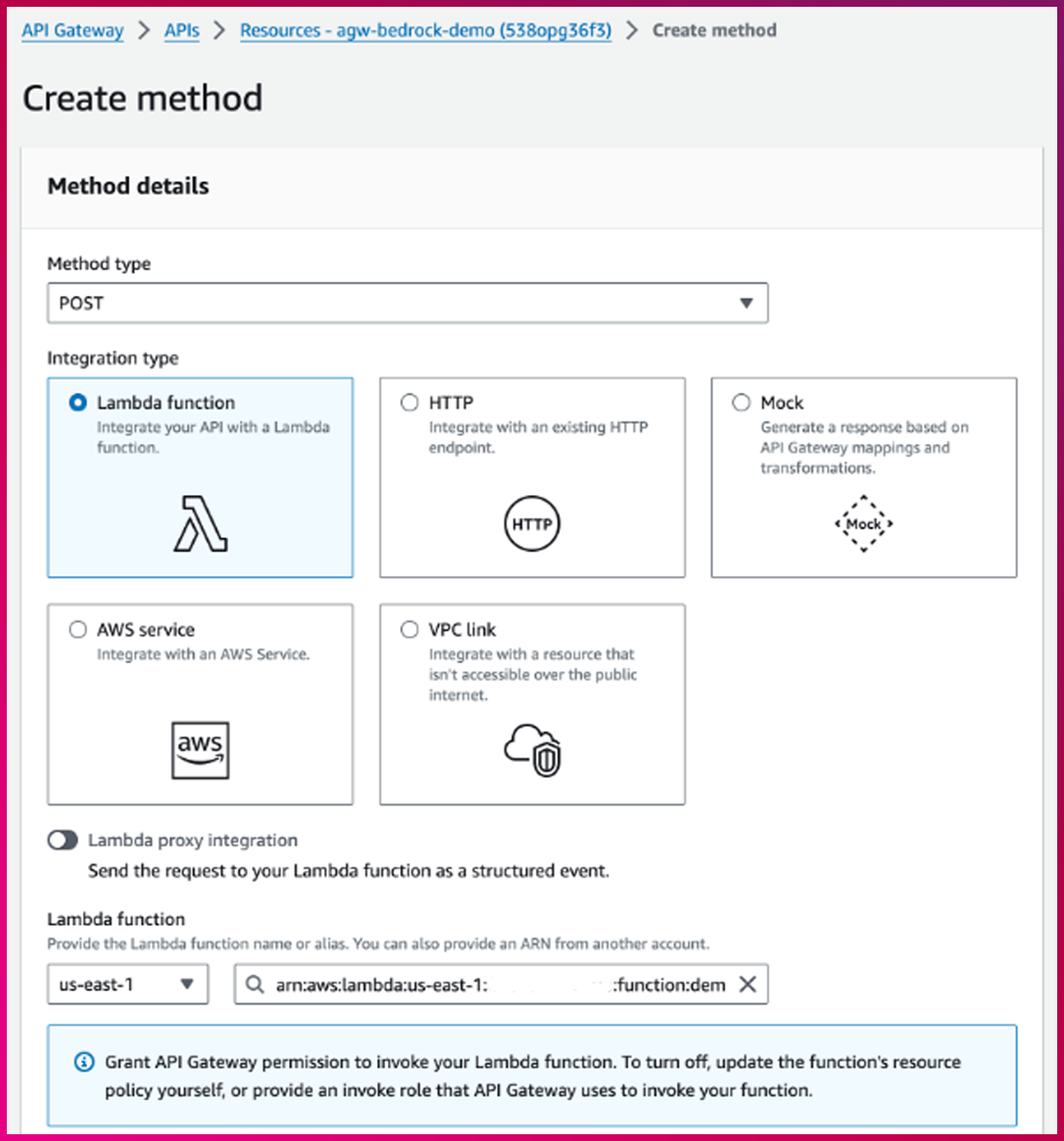 – Integration type : Lambda Function