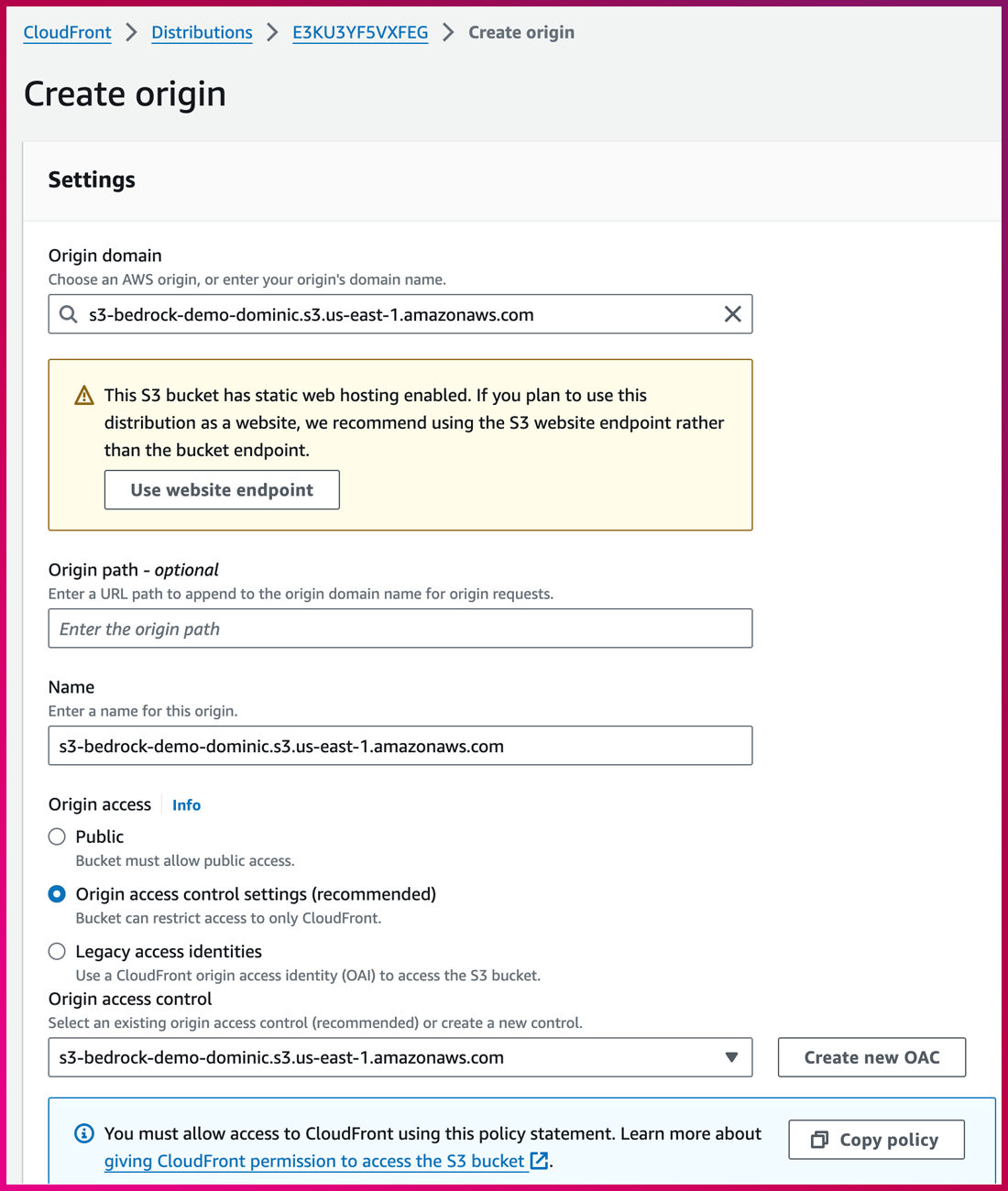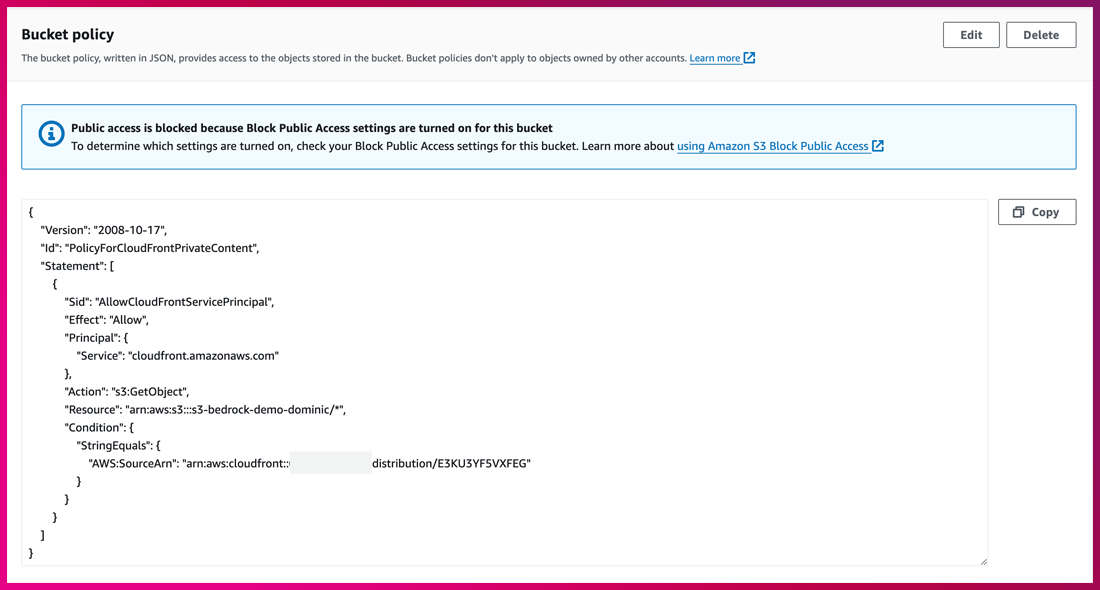 1. S3 Bucket을 Private으로 쓰기 위해 OAC(Origin Access Control)를 별도 구성하여 Bucket policy를 업데이트합니다.