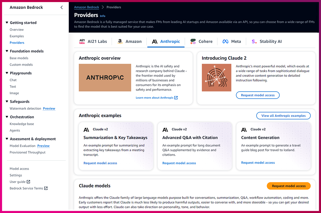 이번 데모에서는 일반 Foundation model invoke 와의 동일한 비교를 위해 Anthropic Claude v2를 사용하겠습니다.
