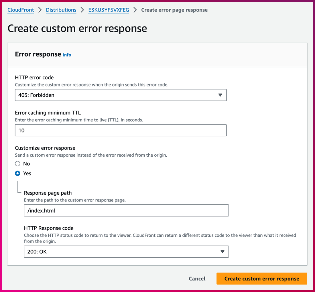 • CloudFront ➔ Distributions ➔ 생성 된 Distribution ➔ Error pages ➔ Create custom error response