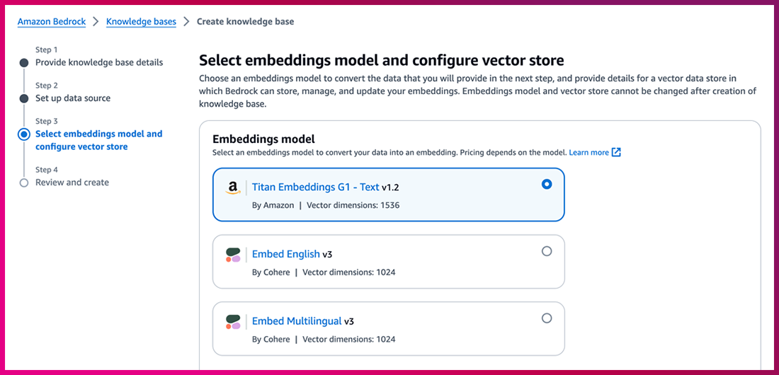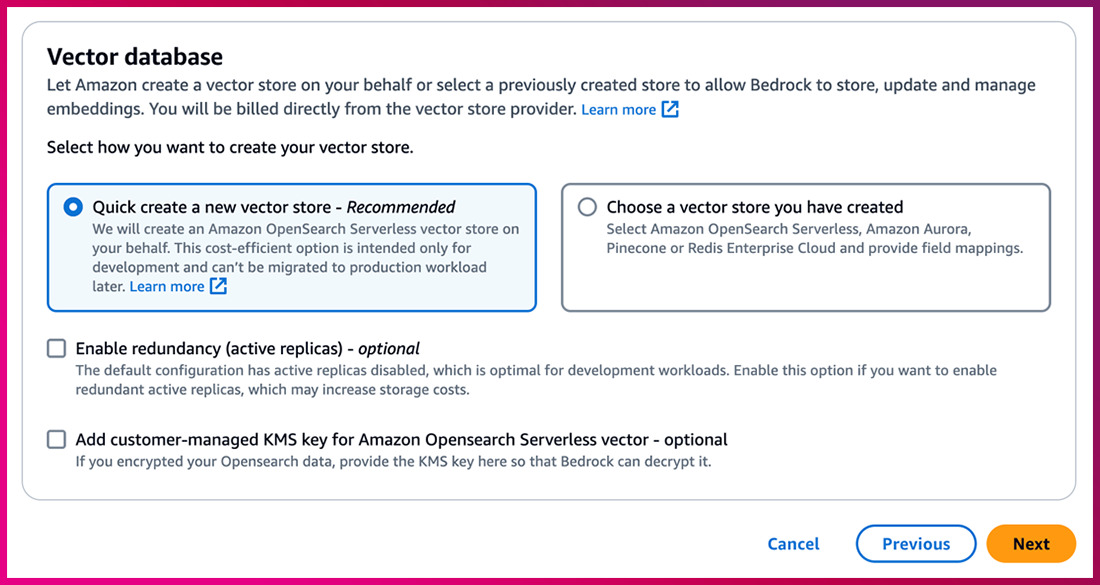 – Vector database : Knowledge base에선 기존에 사용자가 구축한 4가지 종류의 Vector database를 지원하고 있습니다. Vector database는 비용과 사용성을 고려해 선택해야 합니다.