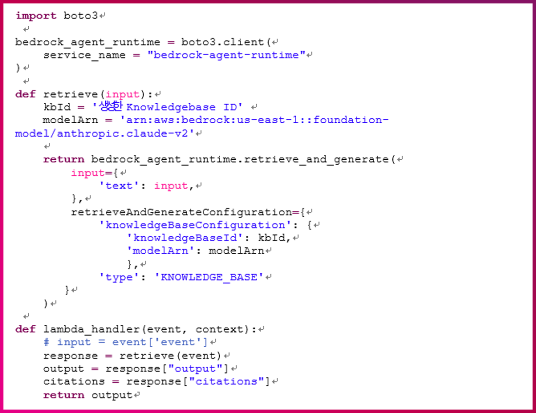 – Lambda function : 이전 단계에서 생성한 Knowledge base Invoke Lambda function