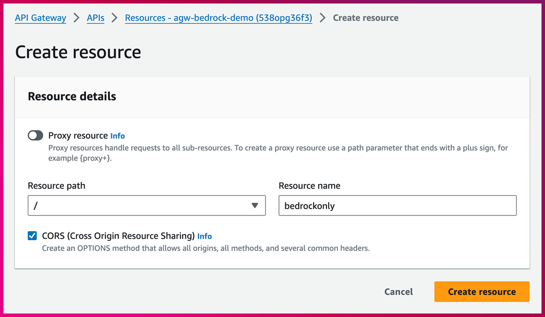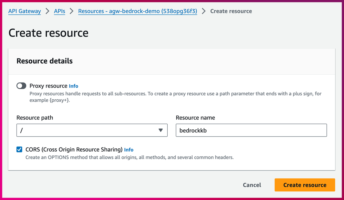 (2) Resources ➔ Create resource ➔ “Check CORS” & “Create resource”