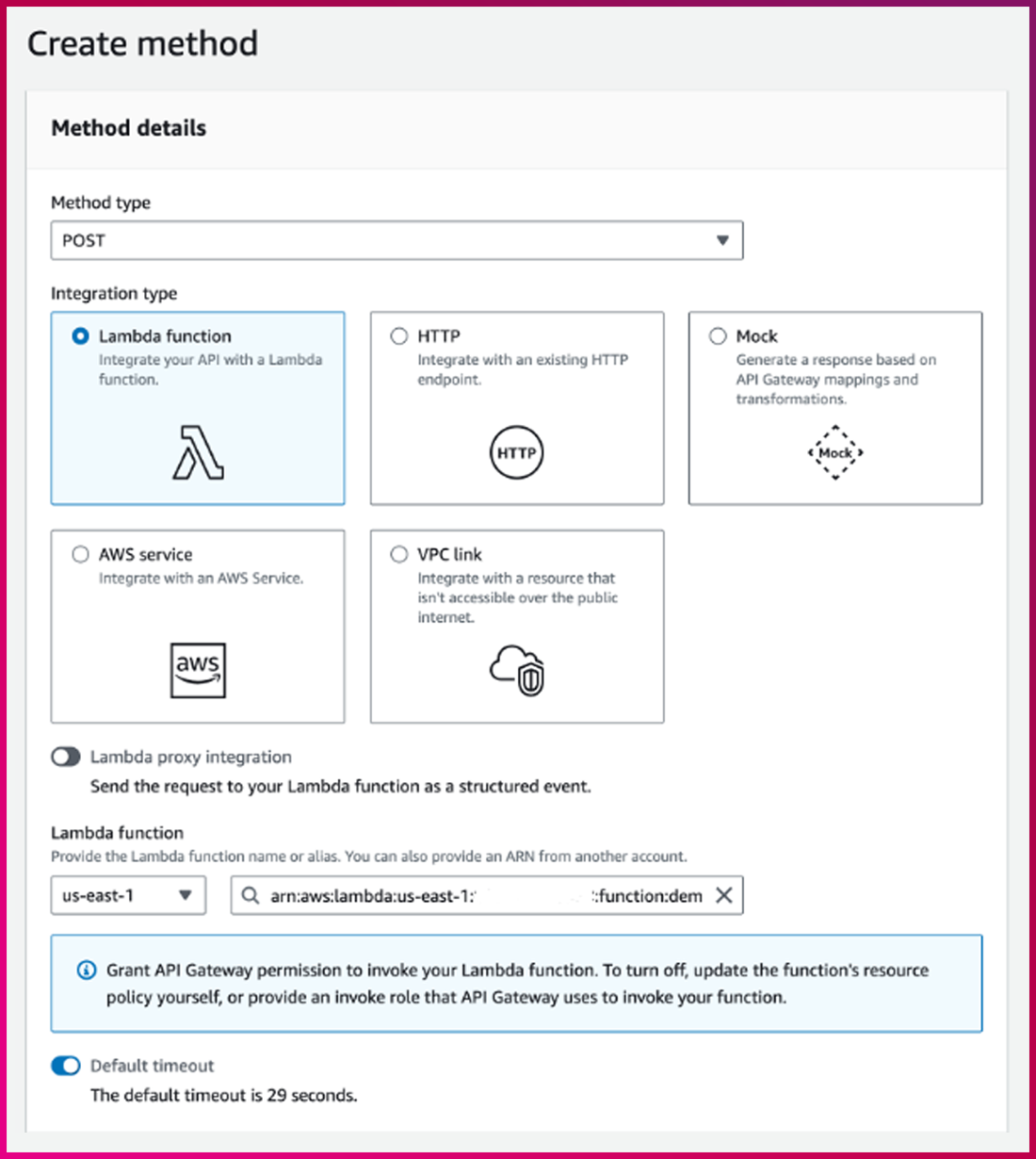 – Integration type : Lambda function