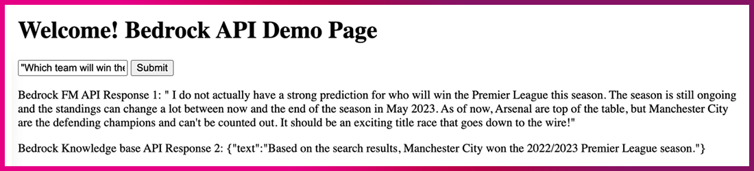 테스트 답변 = ” The 2022/2023 Premier League season is still ongoing. As of February 2023, Arsenal are currently top of the table. The season will conclude in May 2023, so we don’t know the winner yet. Arsenal, Manchester City, and Manchester United are the main title contenders at this stage of the season.”