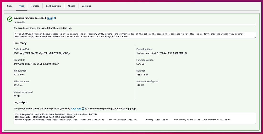 다음과 같이 Knowledge base를 사용한 RAG를 통해 정확한 답변을 얻은 것을 확인할 수 있습니다.
