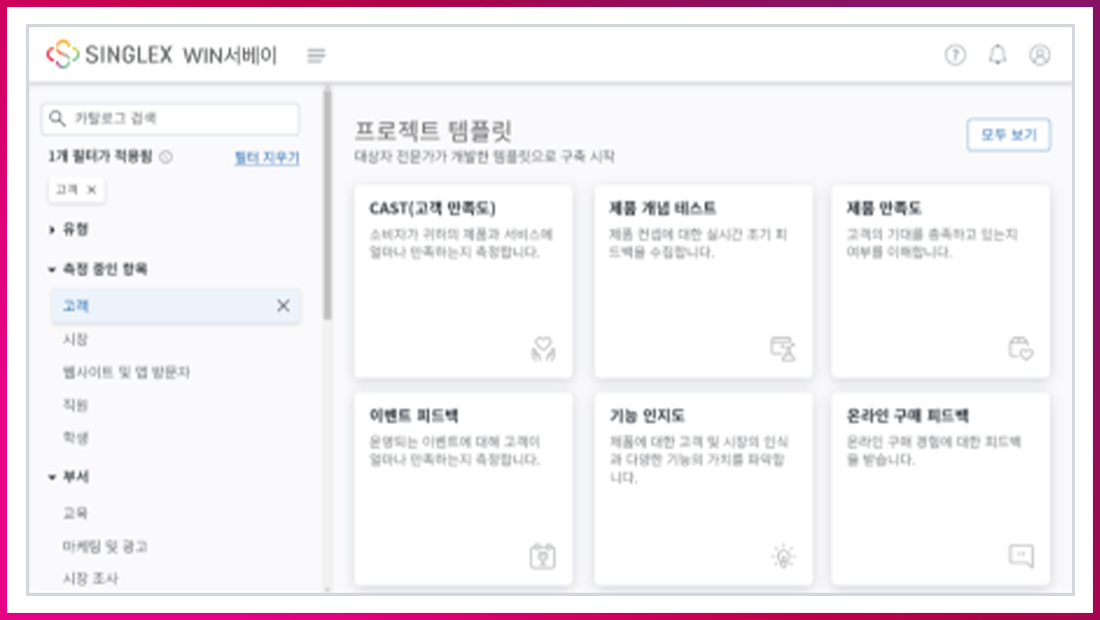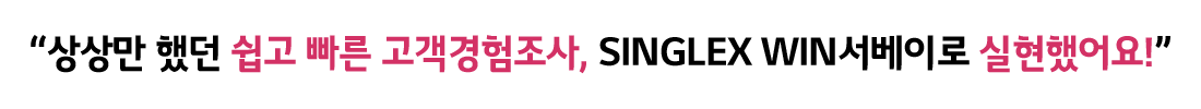 SINGLEX WIN서베이는 원활한 고객 경험 관리를 위한 복합적인 기능을 갖춘 솔루션입니다. SINGLEX WIN서베이를 통해 마치 리서치 전문 업체와 협업하는 듯한 높은 품질의 고객경험조사를 쉽고 간편하게 진행할 수 있었는데요. 특히, SINGLEX WIN서베이가 제공하는 글로벌 리서치 레퍼런스가 고객경험조사 기획에 큰 도움이 됐습니다. 또한 SINGLEX WIN서베이가 제공하는 다양한 설문 템플릿과 작성 가이드를 활용해 높은 품질의 고객경험조사 설계를 쉽고 빠르게 기획할 수 있었습니다.