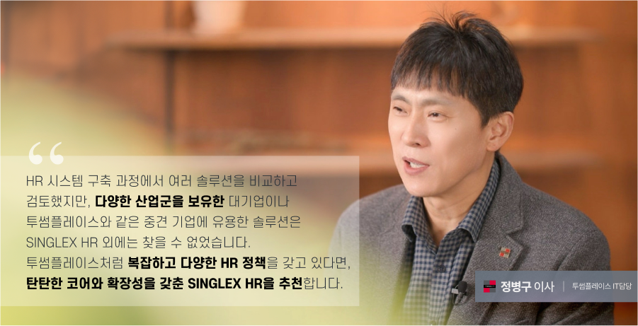이러한 투썸플레이스의 HR 특수성을 고려해 맞춤형으로 구현할 수 있는 솔루션은 SINGLEX HR뿐이었습니다. 정병구 이사는 “일원화된 인사 관리, 대기업 수준의 HR 제도를 포괄하는 기능, 안정적인 시스템 마이그레이션을 모두 지원하는 곳은 SINGLEX HR이 유일했다”고 말하며, SINGLEX HR의 완결성을 높이 평가했습니다.