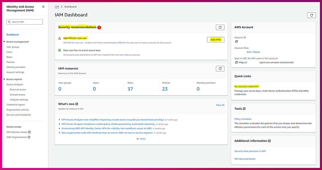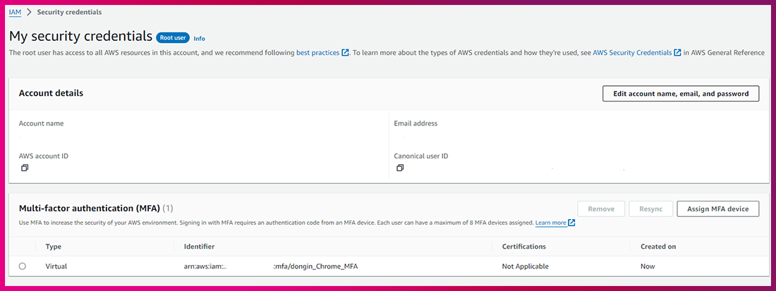 (1) IAM Dashboard ➔ Add MFA(혹은 우측 패널의 Quik Links ➔ My security credentials)