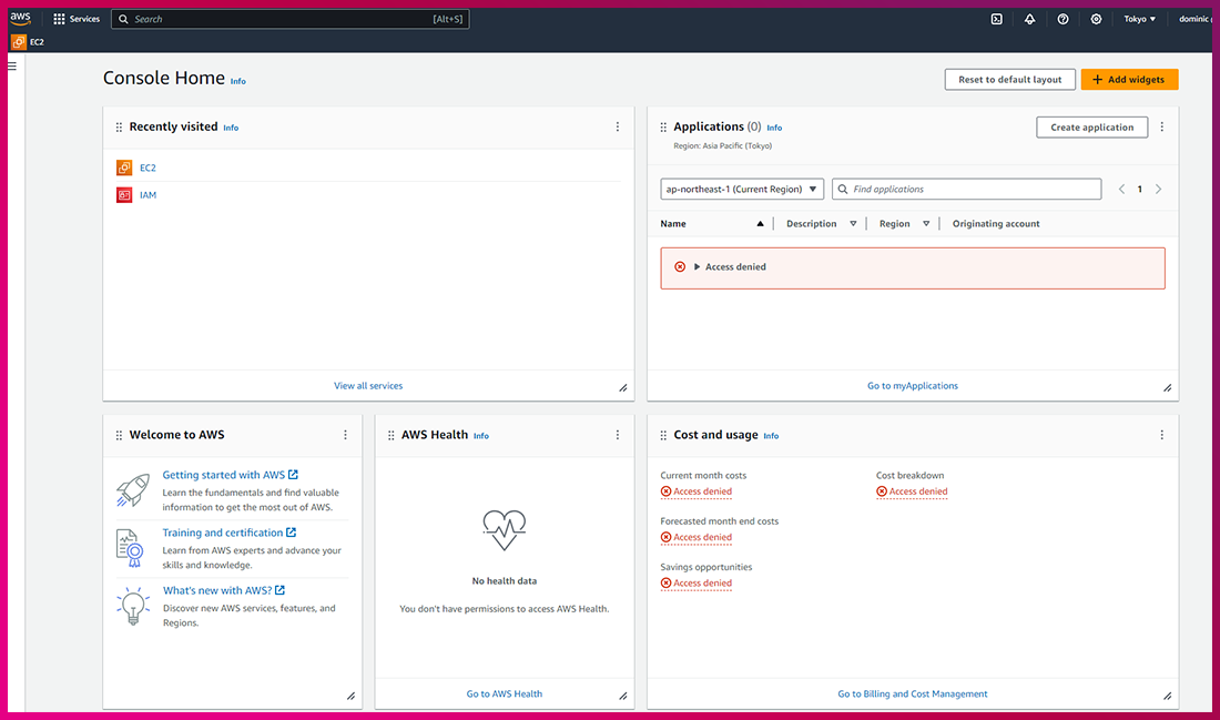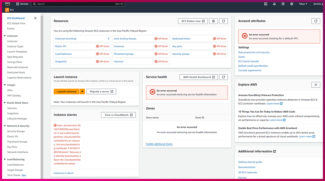 (3) 예시 IAM User에 로그인 후, 서울이 아닌 리전 접속 테스트를 하면 API에러가 발생하는 것을 확인할 수 있습니다.