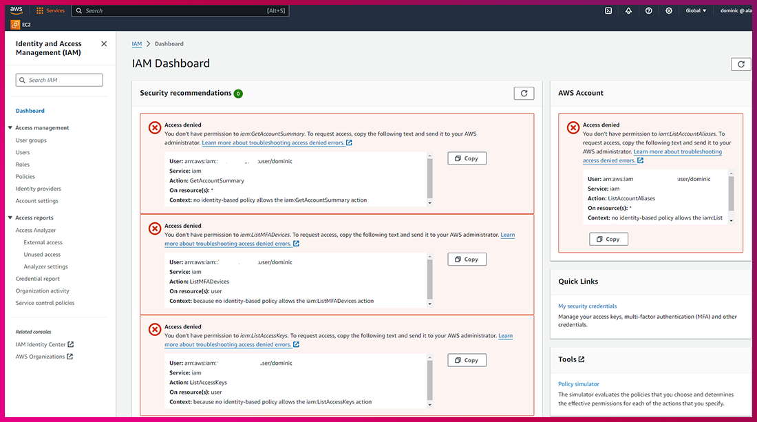 IAM이나 S3(Simple Strong Service, AWS에서 제공하는 인터넷용 스토리지 서비스)과 같은 글로벌 서비스를 사용하기 위해선 다음과 같은 추가 정책을 할당해야 합니다.