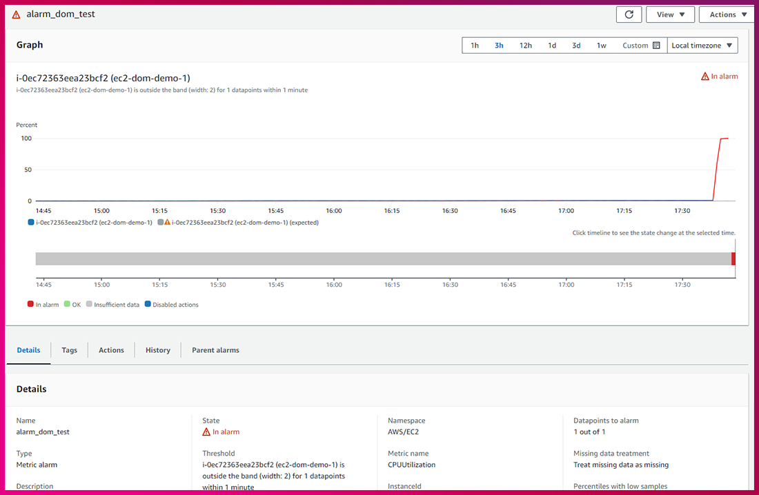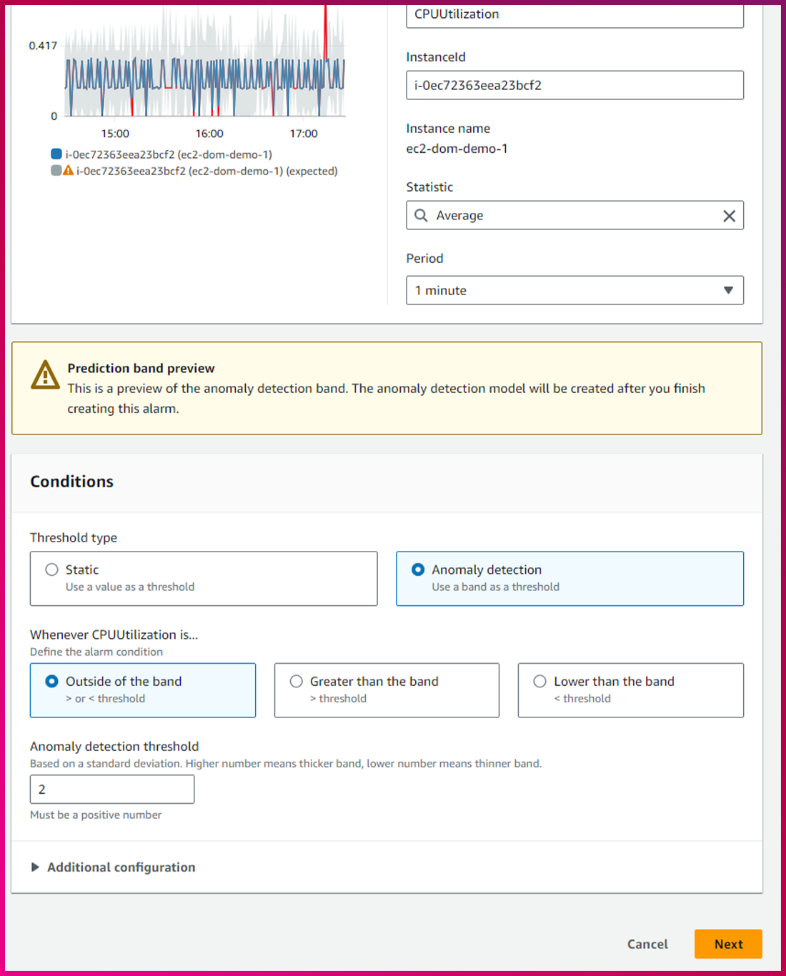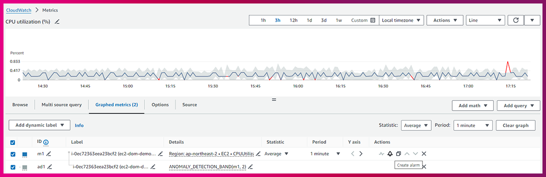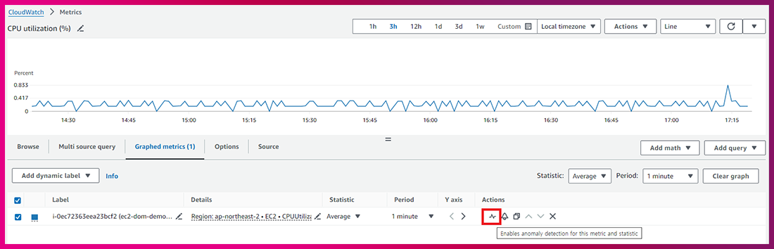 1) CPU Utilization(%) 메트릭에 Actions의 그래프 모양의 아이콘을 눌러 Anomaly detection을 활성화합니다.