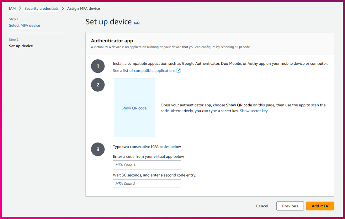 (3) MFA 등록 ➔ Show QR code ➔ 두 번의 코드 입력 ➔ Add MFA