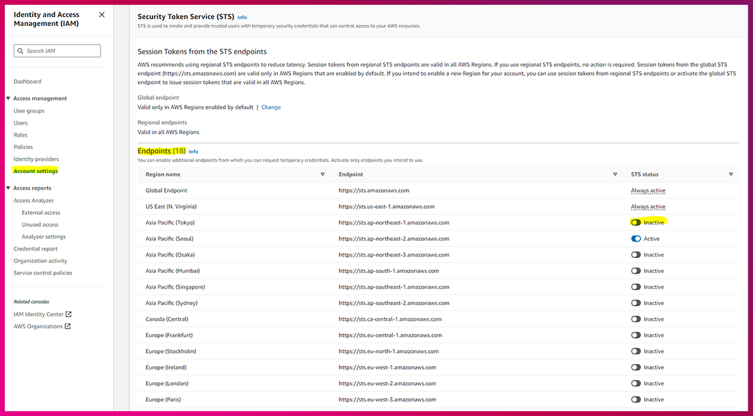 (1) IAM ➔ Account settings ➔ STS(Security Token Service) ➔ 사용하지 않는 Region Inactive