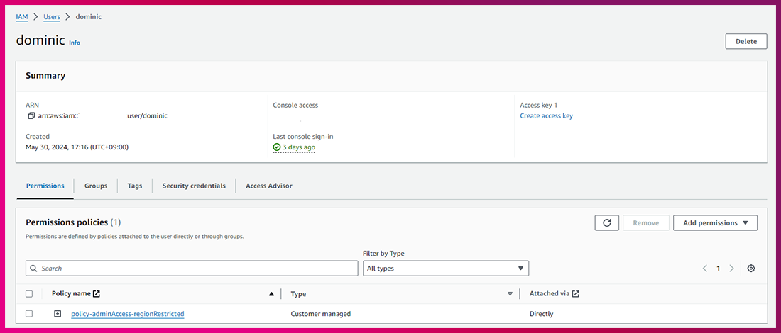 다음은 서울 리전에만 접근 가능한 Admin Access 예시입니다.