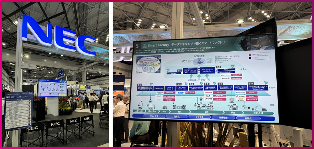 NEC는 디지털 트랜스포메이션과 스마트 제조 솔루션에 중점을 두었으며, AI, IoT, 사이버 보안을 통한 생산성 및 효율성 향상 기술을 소개했습니다.